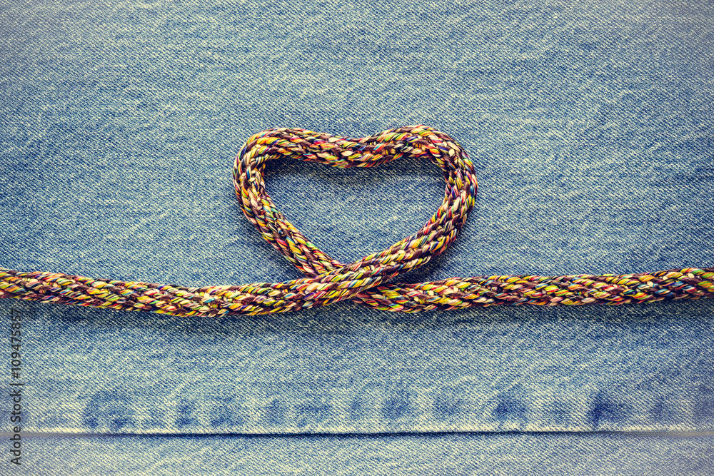 Love heart shaped rope on denim jeans background