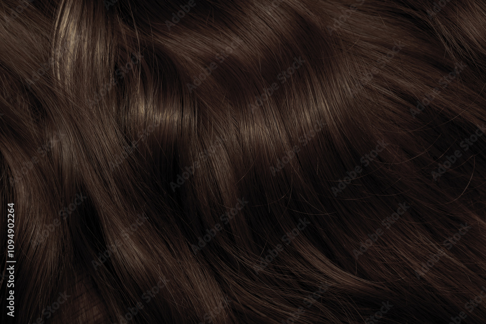 Brown hair close-up as a background. Women's long brown hair. Beautifully styled wavy shiny curls. Hair coloring. Hairdressing procedures, extension.