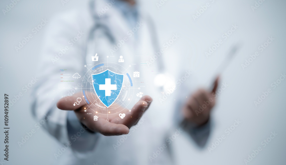 Doctor holding a holographic shield with a medical cross, symbolizing healthcare protection, digital health, and innovation. Perfect for health insurance and medical technology concepts