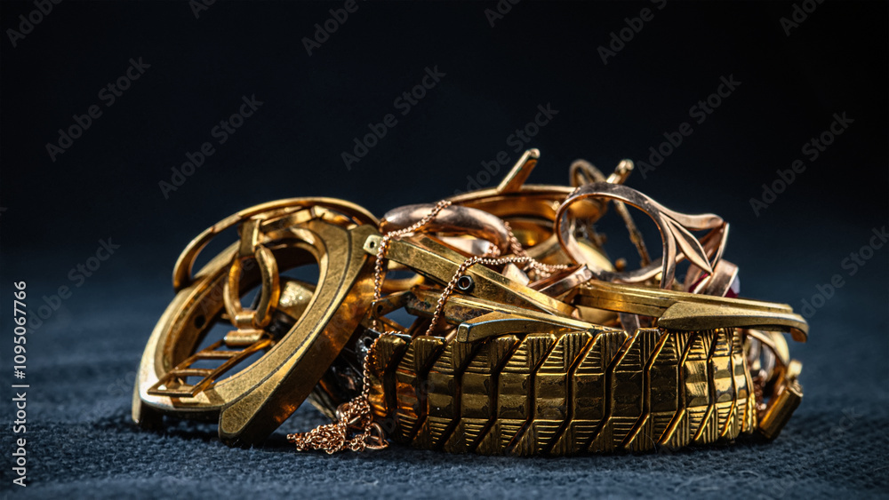 Old and broken jewelry, watches of gold and gold-plated on a dark background. A scrap of gold. Selective focus.