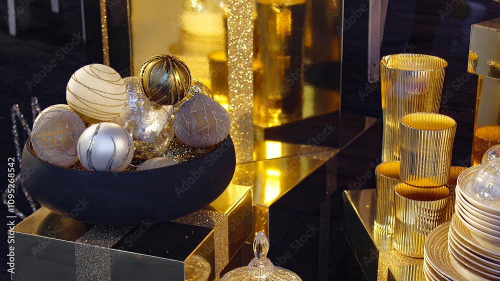 Christmas tree balls gold and white, glass decorations for Christmas tree, gold decorations, candles, shiny balls, gifts in gold packaging with bows, holiday decor, Italy