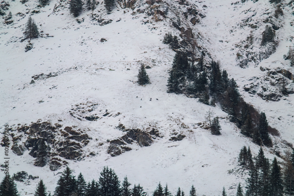 chamois area with a groups of chamois in the hohe tauern national park in austria at a autumn day in november with fresh snow