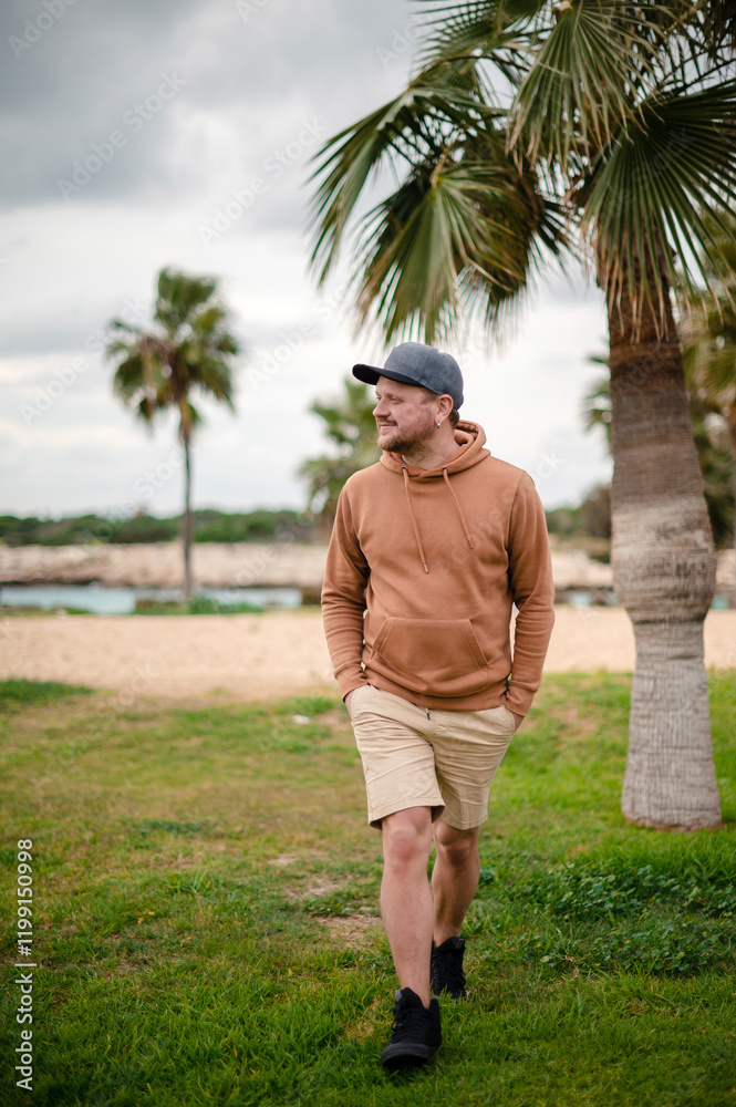 Hand holding DIY reindeer puppet made of cardboard tubes, red plastic caps, and paper details. Studio shot on a blue background. Christmas craft and holiday decoration concept,