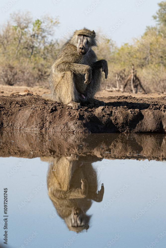 Baboon sitting on the edge of a water hole looking at its reflection