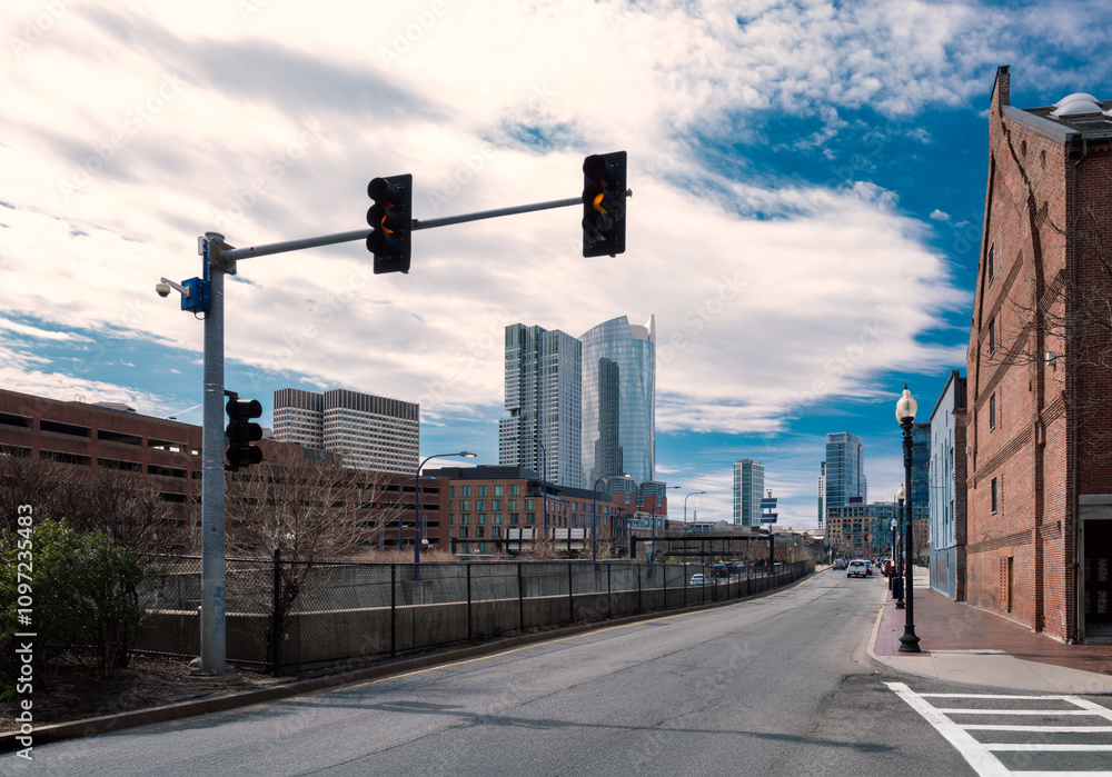 Traffic Light in an Urban Street with Skyscraper Backdrop