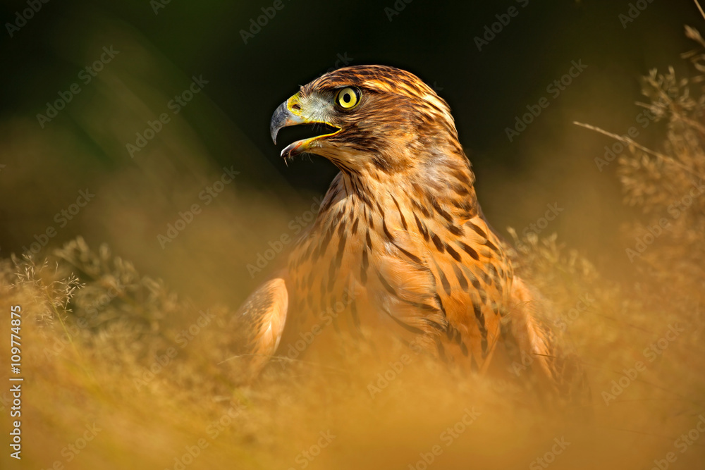 Red-tailed Hawk, Buteo jamaicensis, bird of prey portrait with open bill with blurred habitat in background, hidden in the grass, green forest at the background, USA