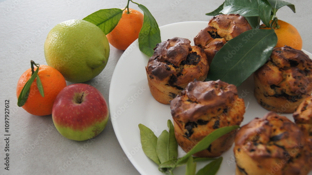 Muffins with ricotta and plum filling, cottage cheese muffins with golden crust, breakfast with muffin, apples, tangerines and Christmas sweets, desserts for the family, on a white plate, Italy