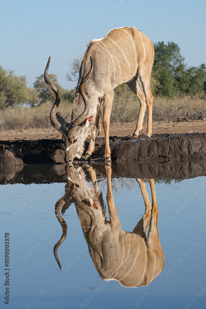 Kudu drinking at a water hole in Mashatu with its reflection clearly showing