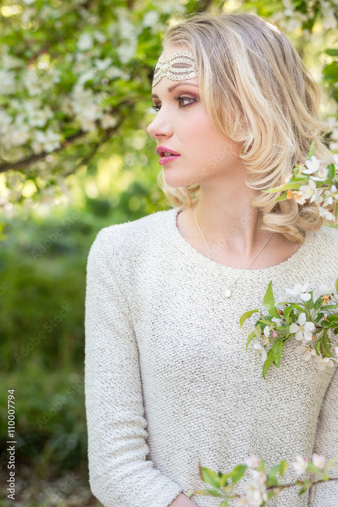 Junge Frau im Vintage Look vor blühenden Apfelbaumen - Frühling