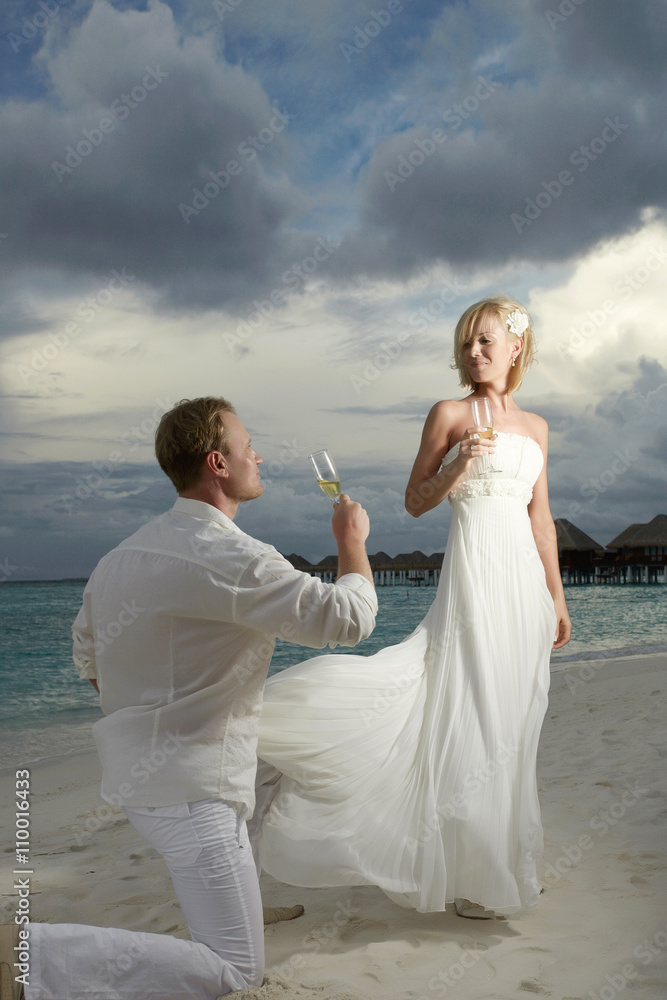 Wedding couple, bride and groom drinking champagne under threate