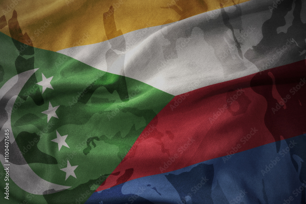 colourful waving flag of comoros on the old army khaki texture background. military concept.