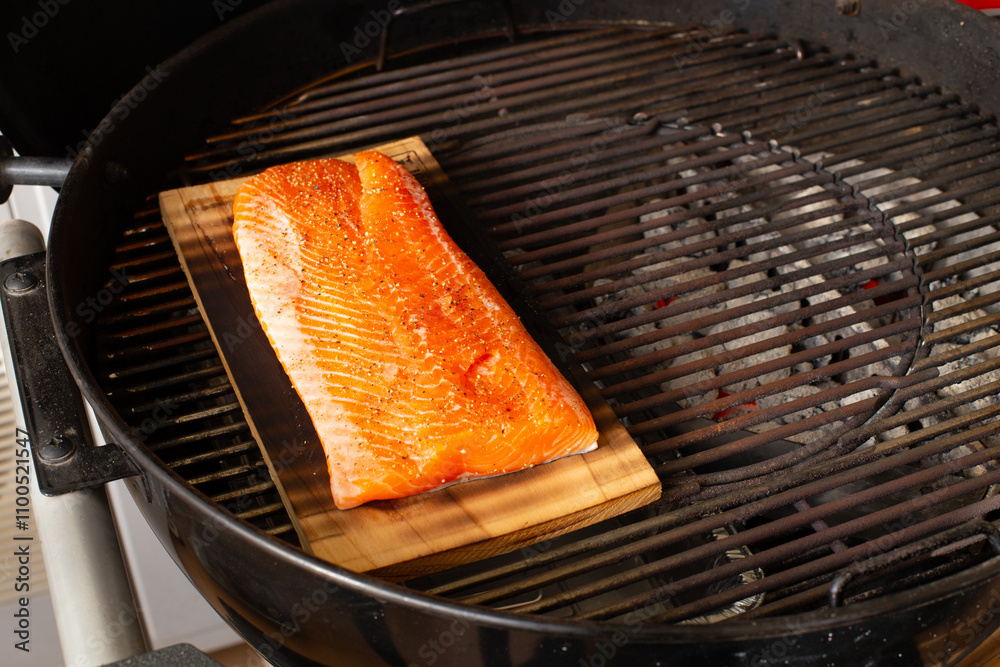 Grilled salmon on a cedar plank over a charcoal grill, showcasing vibrant orange fish fillet cooking with indirect heat