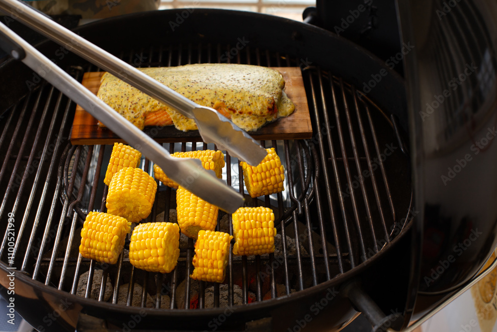 Close-up of grilled salmon with mustard topping and roasted corn on the cob over a barbecue grill