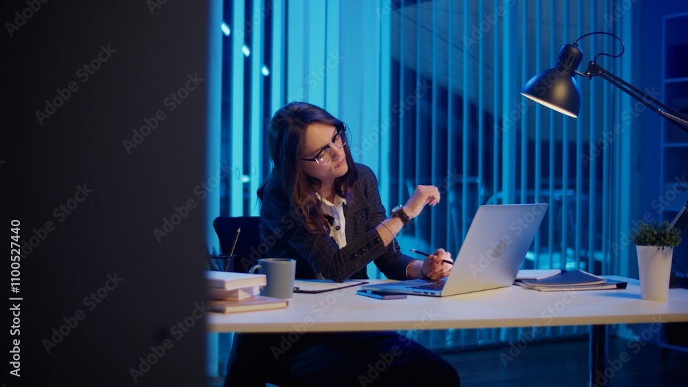 A Tired Businesswoman Sits Late in the Office, Yawning and Struggling to Work on Her Computer. Concept of Workplace Fatigue, Long Hours, and Exhaustion While Trying to Stay Productive