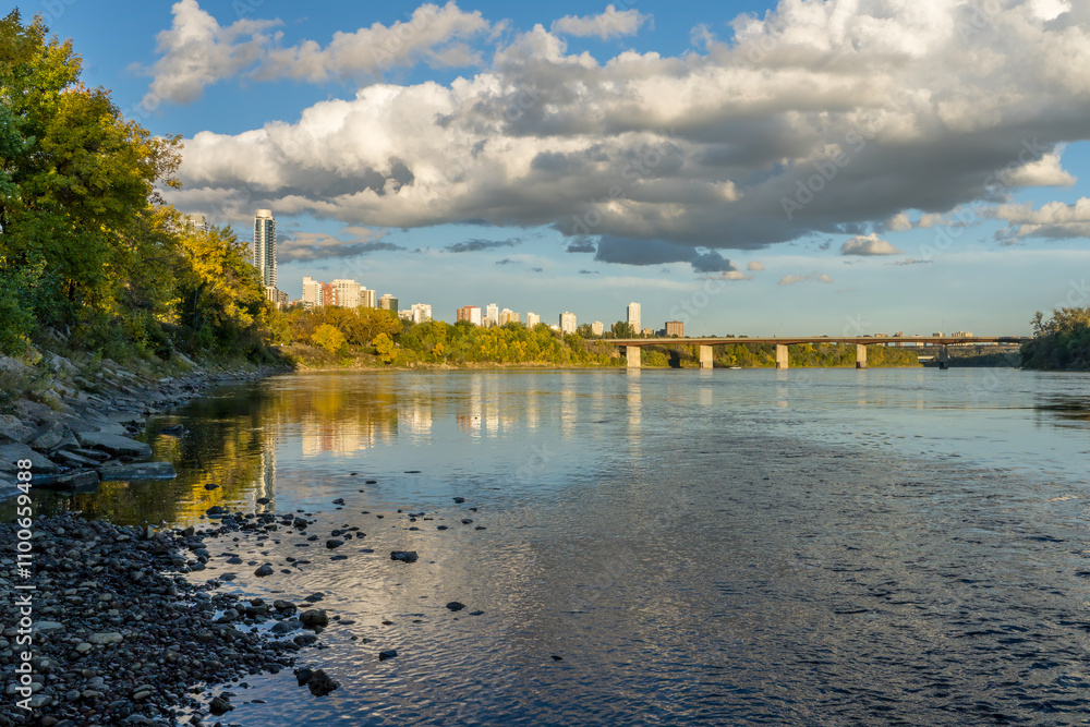 View to Groat bridge North Saskatchewan river valley landscape, Edmonton