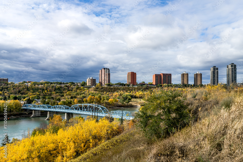 Edmonton cityscape with Dawson Bridge and high rises building along LRT line on background in fall season