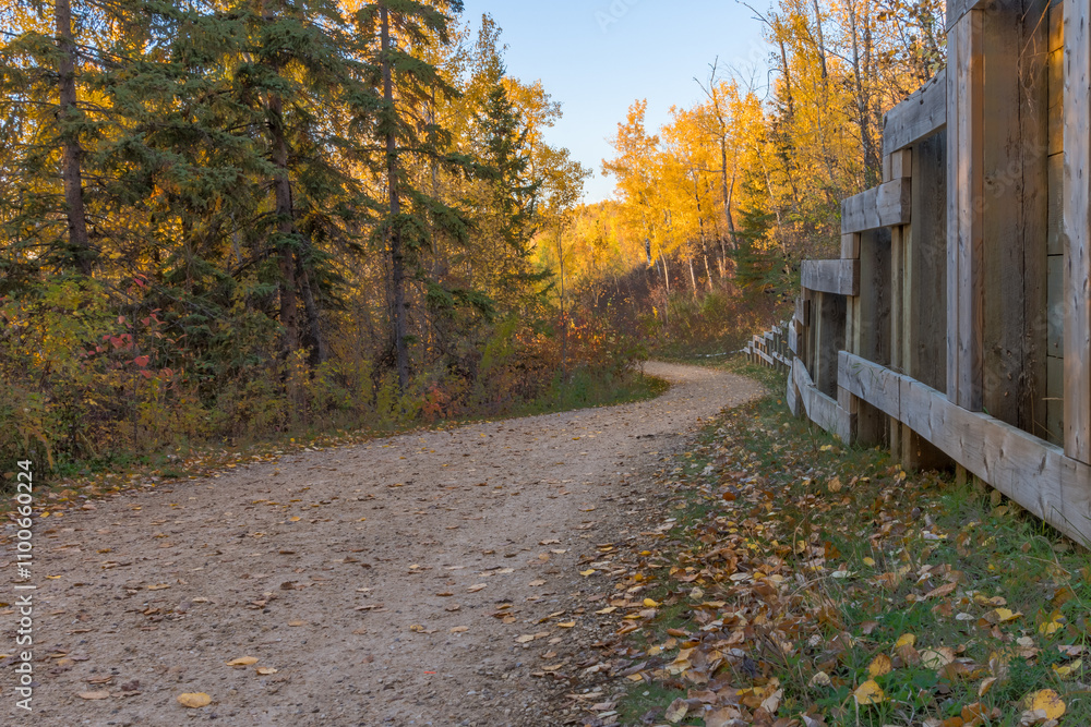 Retaining wall along pedestrian and bike path in city park in fall season with yellow colored foliage
