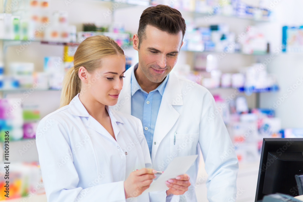 Female and male pharmacists in pharmacy