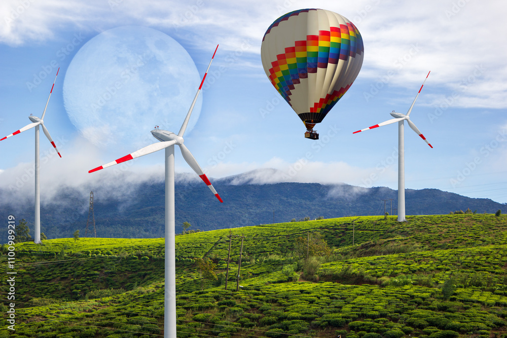 Enjoy a scenic hot air balloon ride over beautiful wind turbines and lush green hills