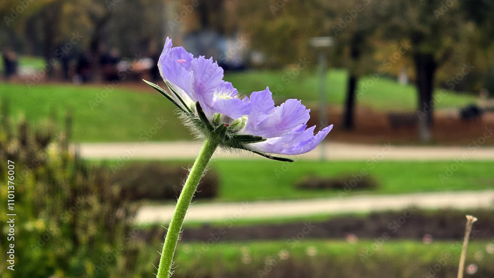 Violet flower head Scabieuse du Caucase in deep autumn in the park. Flowers in late autumn in the park
