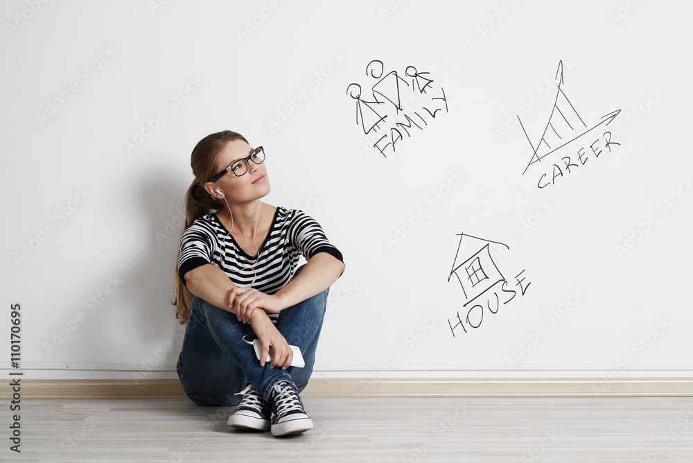 Young thoughtful woman dreaming about her future, planning successful career, big family and new housing.