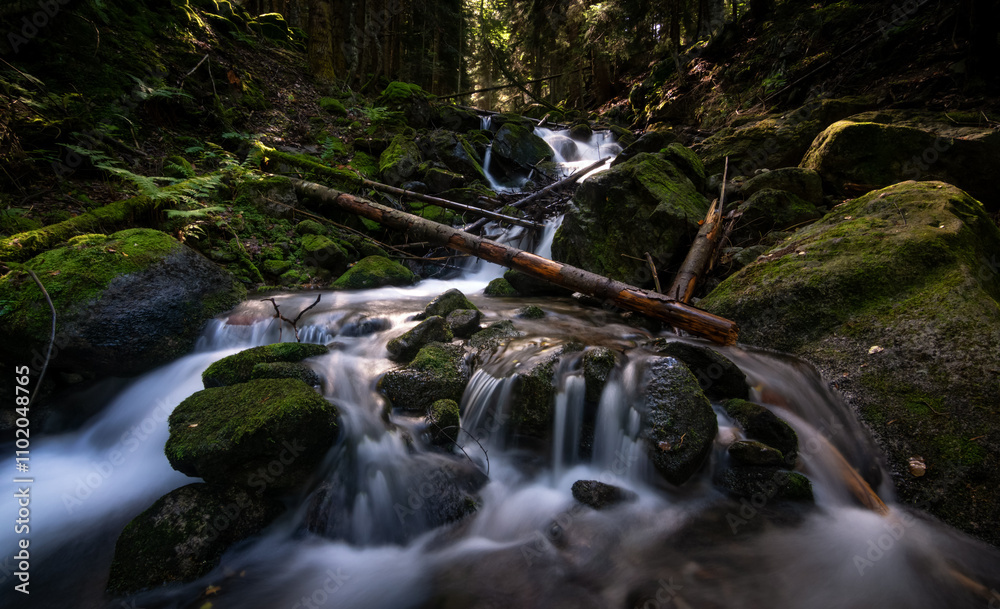 Mountain forest stream with waterfall in the Caucasus, Russia