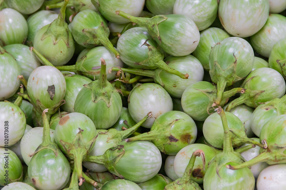 Fresh pile Thai eggplants or green brinjals in local market at Thailand.