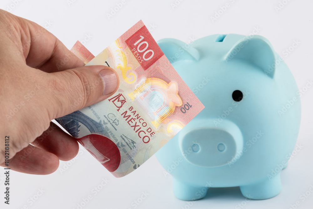 100 Mexican pesos bill in man's fingers and blue piggy bank