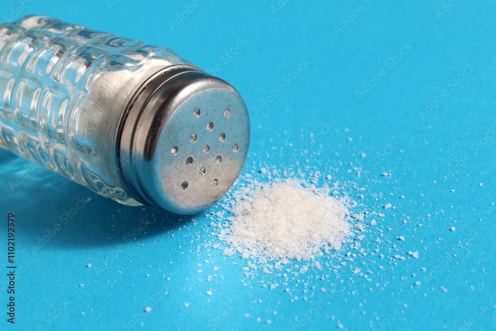 On a blue background lies an overturned salt shaker with salt.
