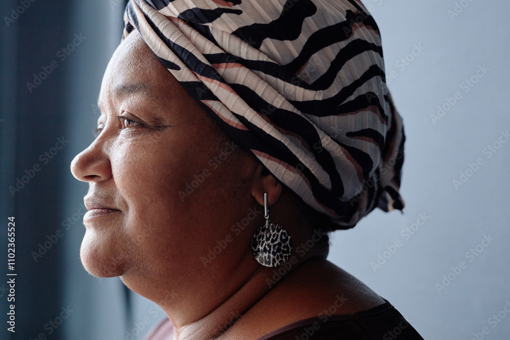 Minimal closeup portrait of Black senior woman wearing headscarf and smiling looking away in soft natural light accentuating profile