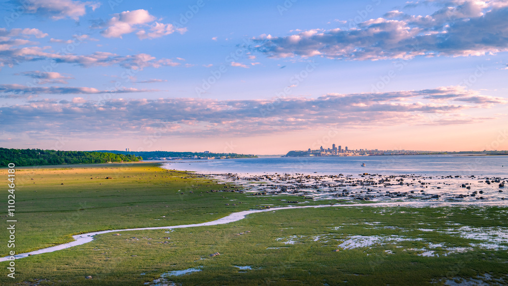 Wonderful dusk light over the landscape, Quebec city at the horizon, QC, Canada