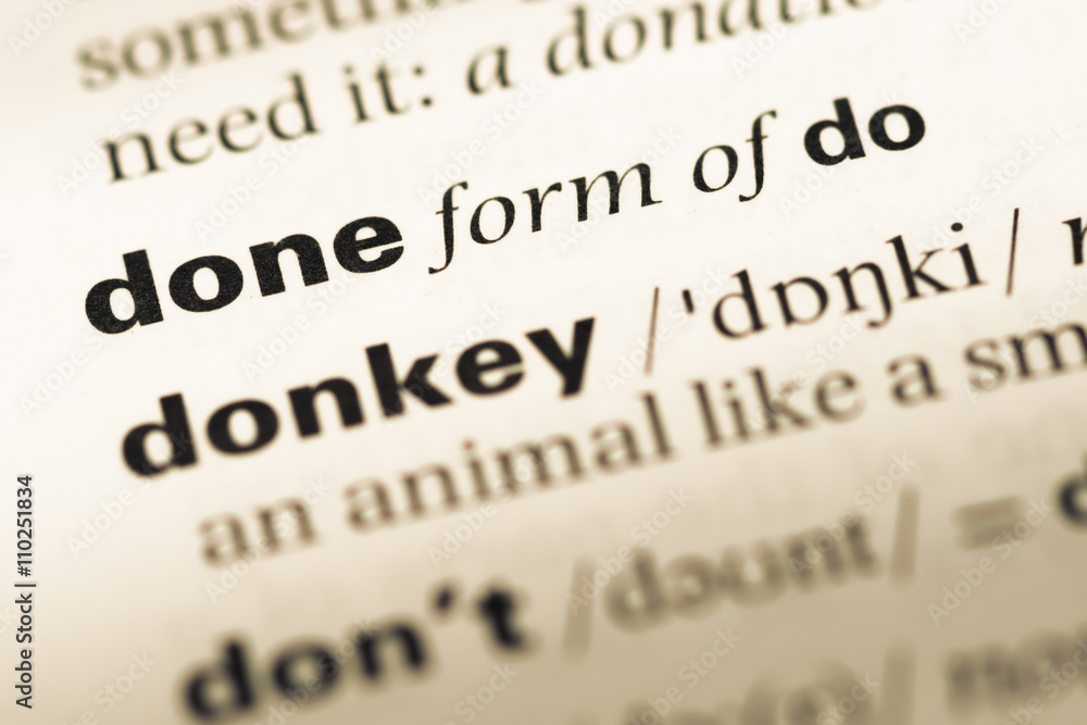 Close up of old English dictionary page with word done