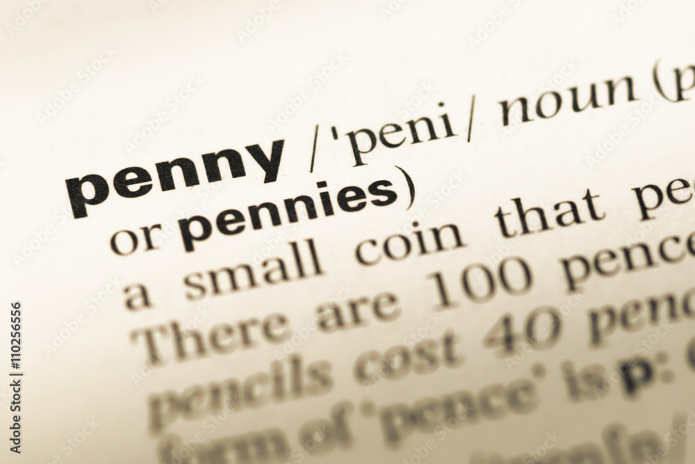 Close up of old English dictionary page with word penny