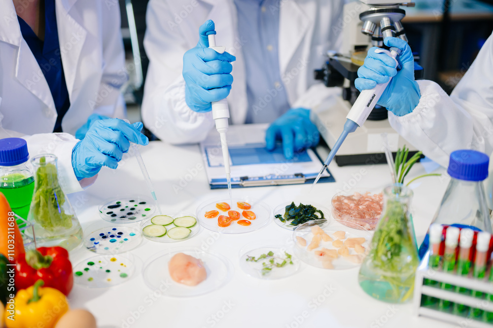 Dynamic scene of food scientists using microscopes and pipettes in a lab,