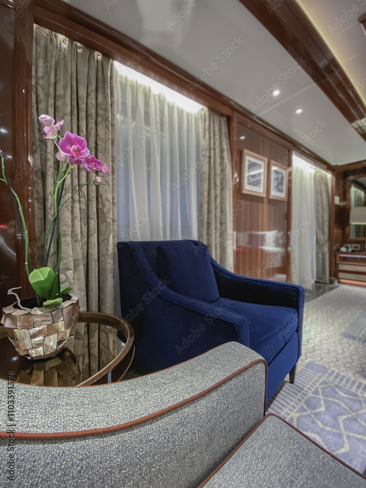 Luxurious ocean view or oceanview or outside balcony veranda cabin stateroom suite queen living room on luxury ocean liner cruiseship cruise ship in classic classy interior Art Deco style design