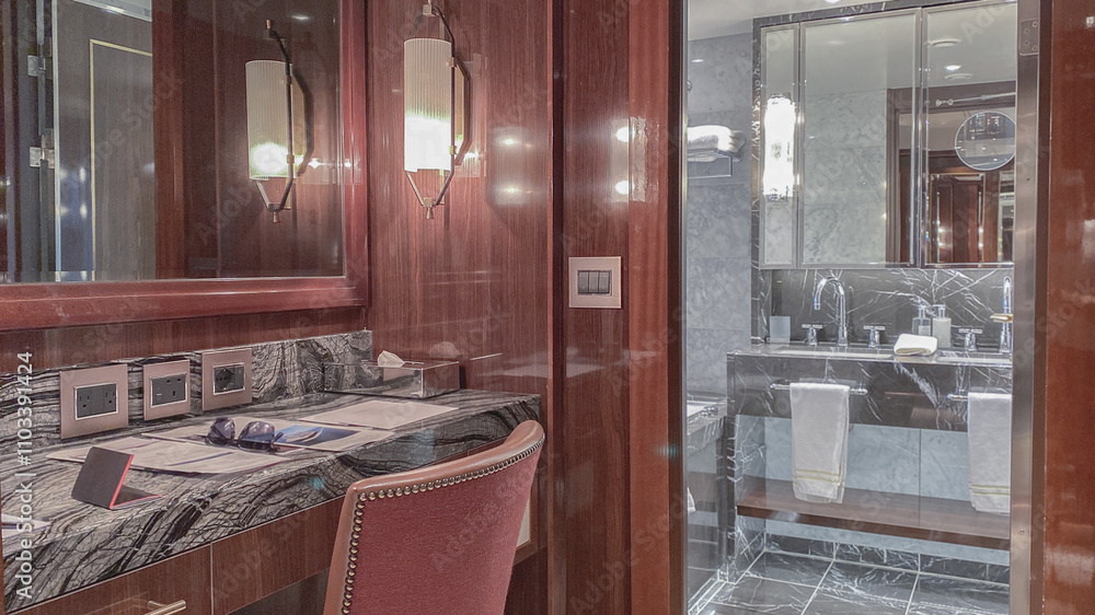 Luxurious ocean view or oceanview or outside balcony veranda cabin stateroom suite queen living room on luxury ocean liner cruiseship cruise ship in classic classy interior Art Deco style design