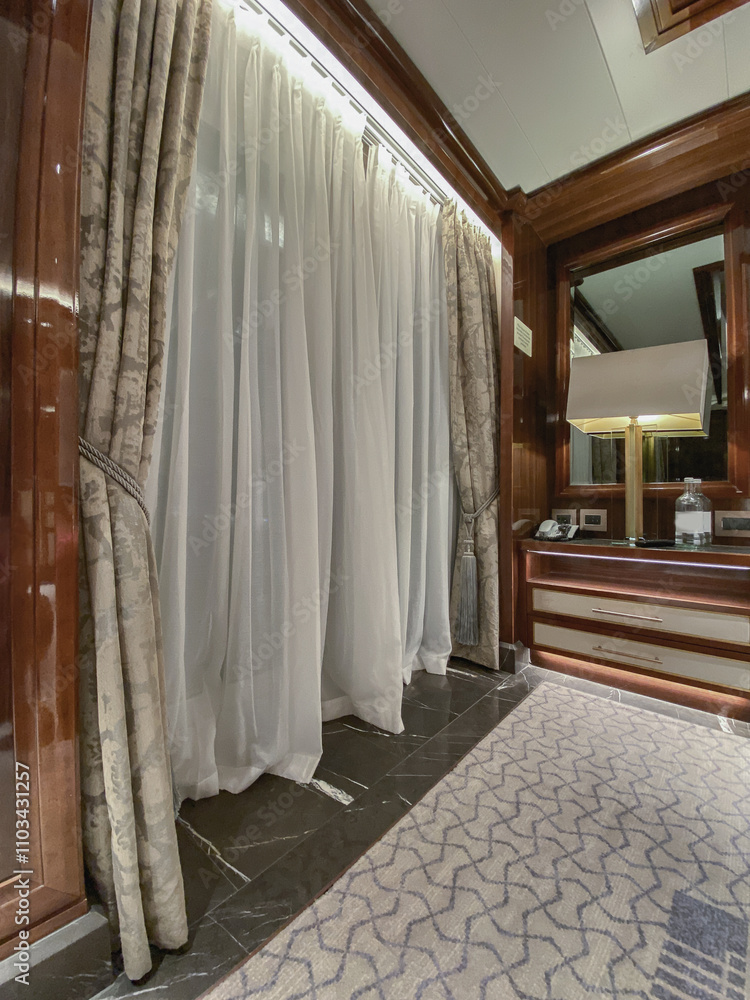 Luxurious ocean view or oceanview or outside balcony veranda cabin stateroom suite queen king double bed on luxury ocean liner cruiseship cruise ship in classic classy interior Art Deco style design