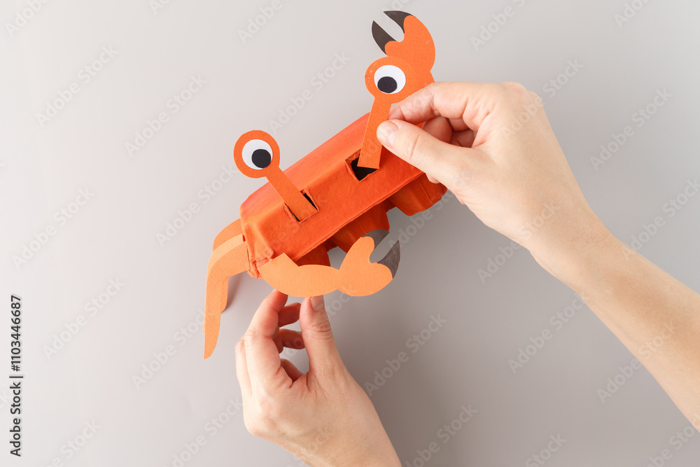 a fun craft project crab creation is made from an orange-painted egg carton. The crab has two big googly eyes on top, fashioned from paper circles with black pupils, sitting on orange paper stalks.