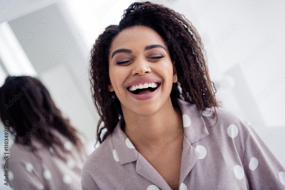 Joyful young woman with beautiful afro hair laughing in cozy dotted pajama indoors