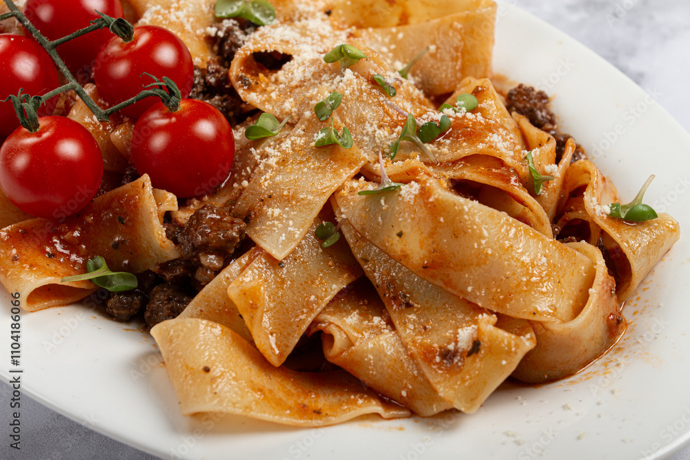 pappardelle pasta with bolognese sauce, topped with parmesan cheese and cherry branch, homemade, no people,
