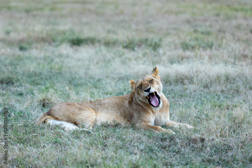 Lioness yawning in the Masai Mara grasslands of East Africa, showcasing the raw beauty of this powerful predator. A captivating wildlife stock photo capturing a moment of natural grace in the wild.