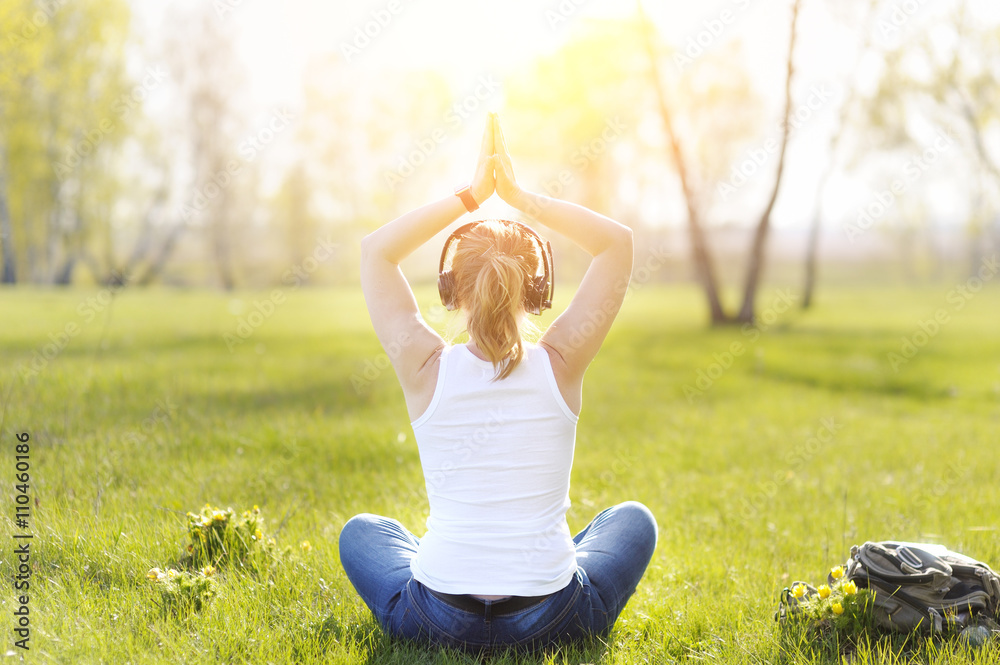 Young woman sitting on grass in Park and meditating and listenin