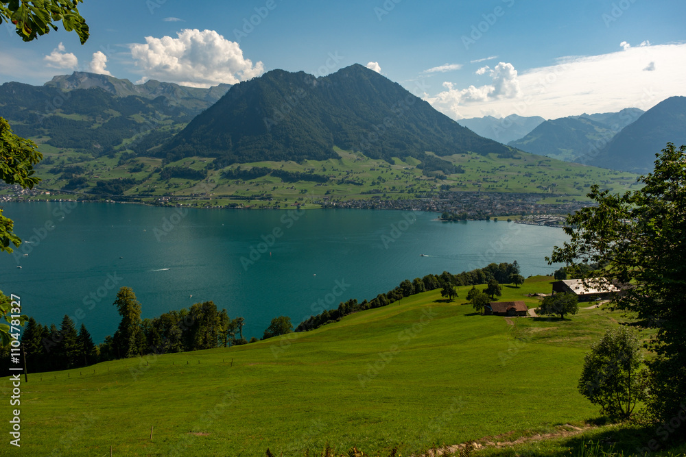 Switzerland lake rural landscape. Switzerland Alps and Lake. Switzerland traveling, hiking, vacation. Alpine pasture in mountains. Mountains in the Swiss Alps. Landscape.