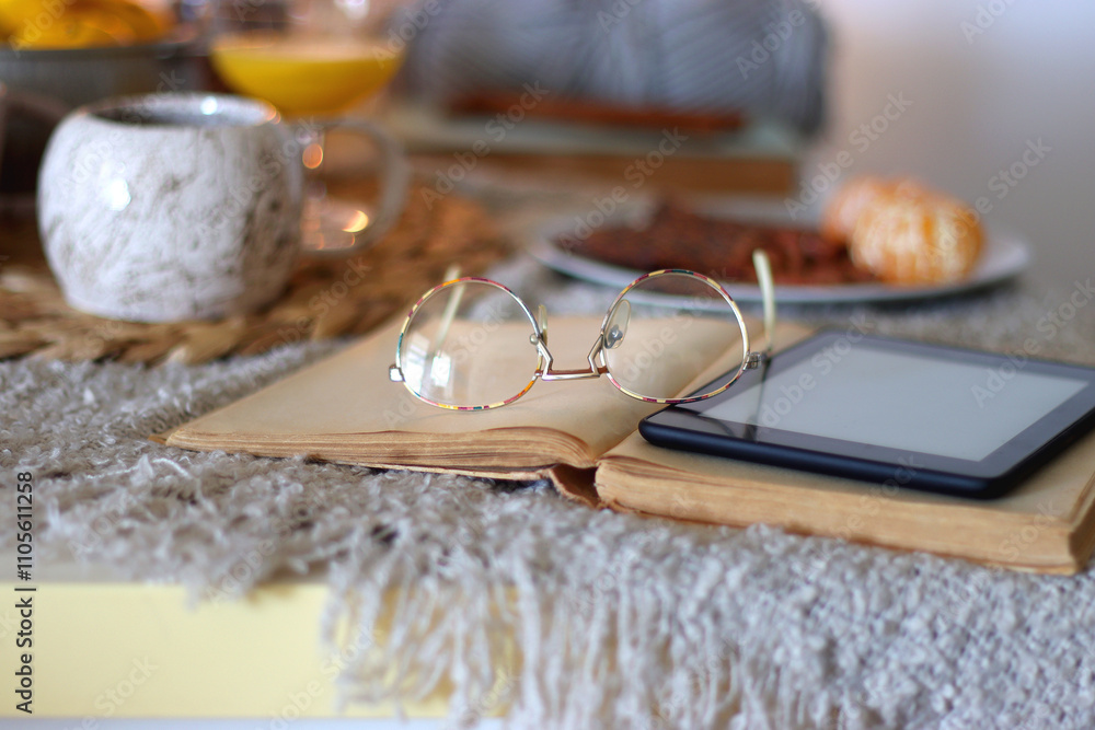 Books, e-reader, tea, orange juice, fruit, snacks, yarn, blanket and lit candles on the table. Autumn or winter at home. Selective focus.