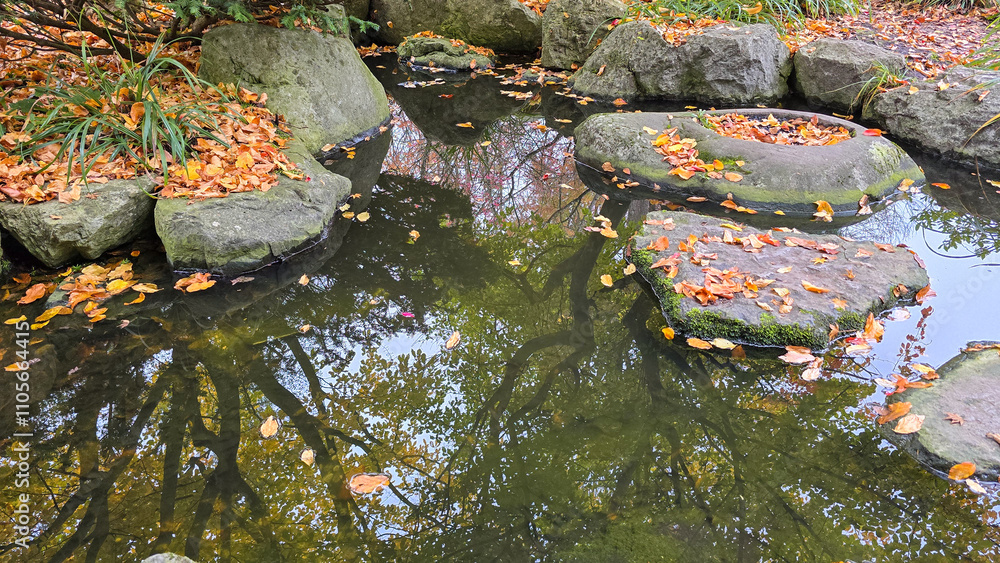 Westpark pond in Munich in late autumn, fallen yellow leaves in the water. Autumn, the trees reflected in the water.