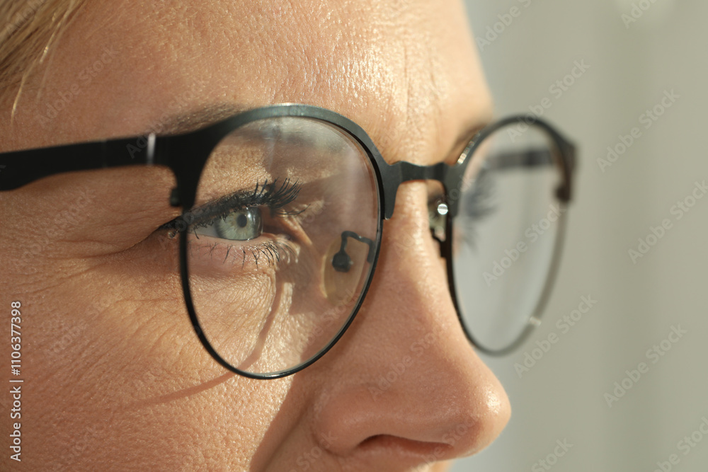 Woman wearing stylish glasses on blurred background, closeup