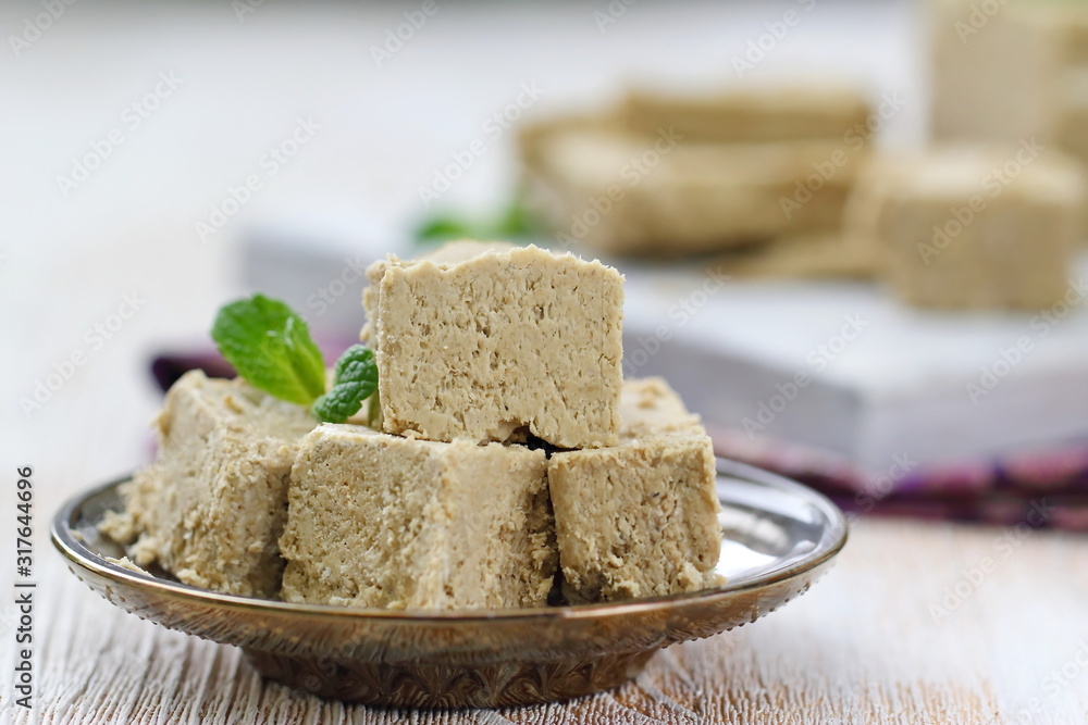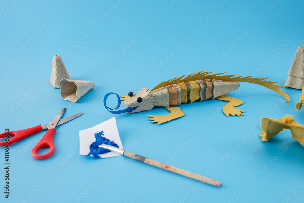 Recycled cardboard iguana craft with scissors, paintbrush, and blue paint on a light blue background. Studio craft photography with copy space. DIY and eco-friendly crafting concept for design