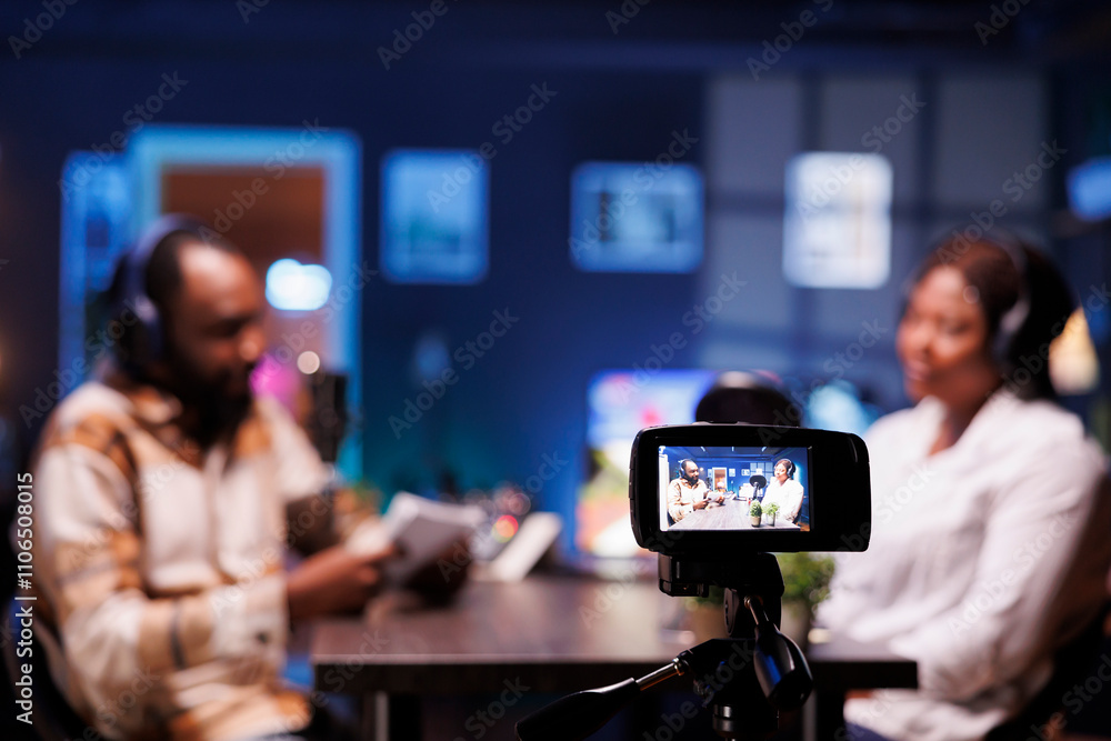 African American male and female bloggers recording podcast in studio with neon lights, filming a livestream for social media. They are an internet video influencer creating content for their channel.