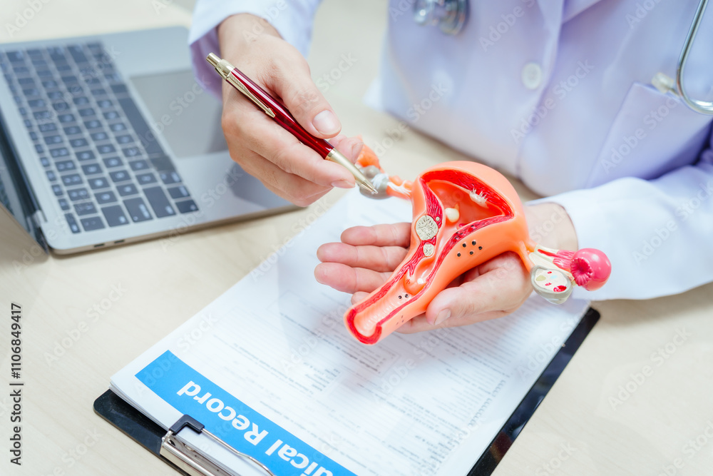 A male doctor wearing glasses sits at a desk in a hospital, discussing a uterus model and women’s health issues like uterine tumors, endometriosis, cervical cancer, and ovarian cancer
