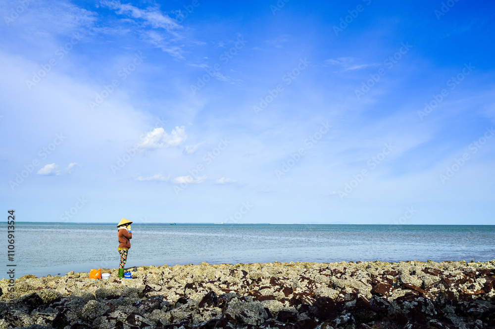 Coastal landscape with rock beach blocking the sea waves in Go Cong, Tien Giang province, Vietnam